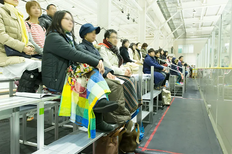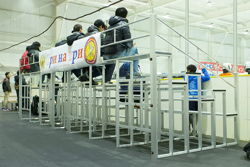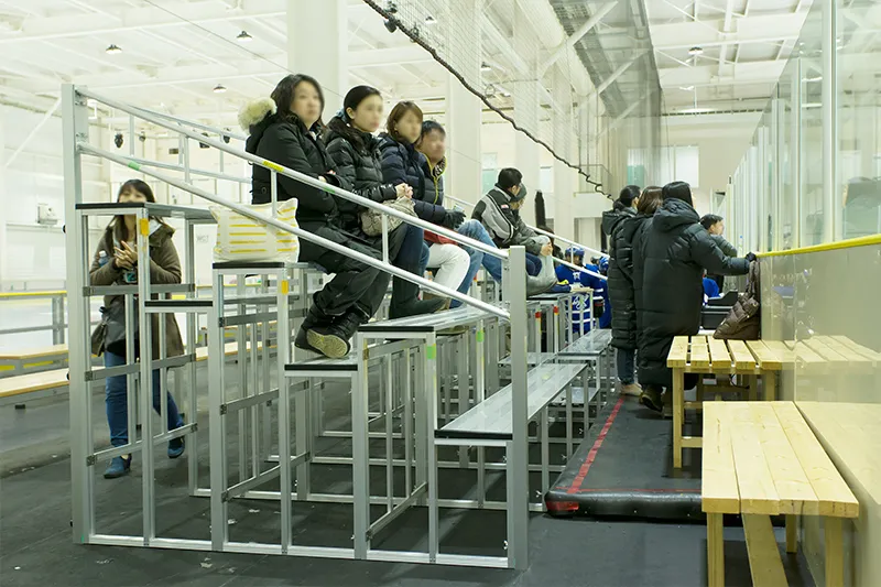 | 導入の動機 | アイスアリーナに観覧席がなく、リンク回りで立ち見か2階で立ち見かのどちらかでした。常設観覧席はスペースの問題で難しいため、仮設の観覧席を検討していました。 規格の観覧席ではリンク回りの腰壁で観にくかったのですが、アリーナ用にカスタマイズしてもらい少し高い観覧席で提案してもらい、組み立ても簡単で収納がコンパクトになるため導入を決めました。 |