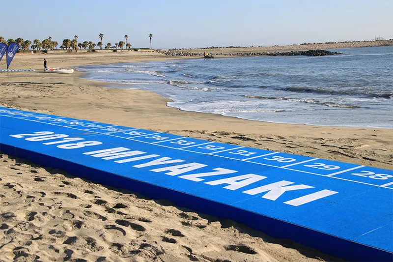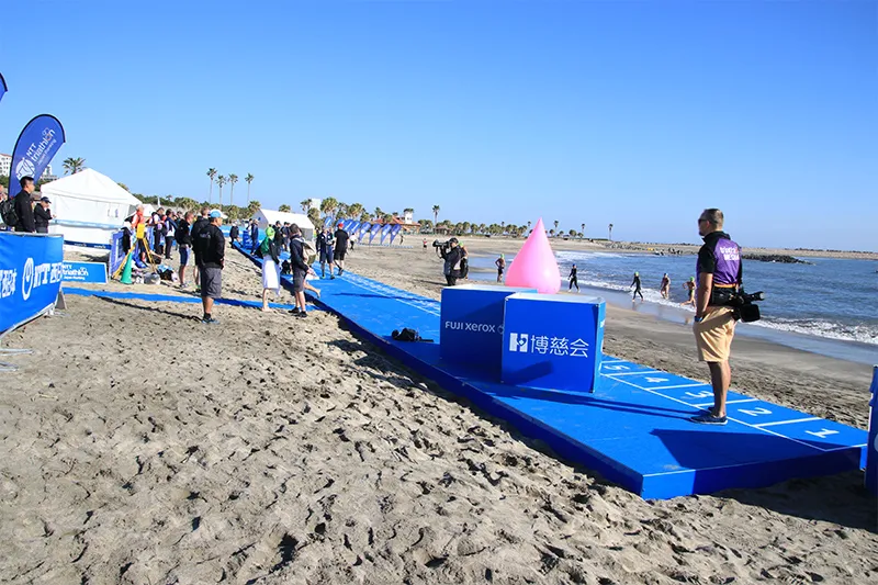 毎年地面にカーペットを敷いてスタート台の代わりにしていましたが、一段高くできるスタート台を検討していました。トライアスロン会場は毎年場所が変わるので、持ち運びや組立が簡単な商品であるアルミ製ステージにしました。収納もコンパクトにできて収納にも困りません。