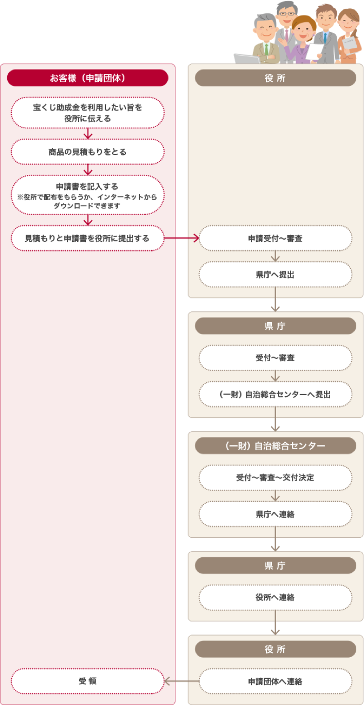 このようなケースで宝くじ助成金を利用する場合、まずは商品の見積もりを取り、市区町村の役所に申請を行います。