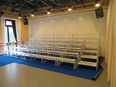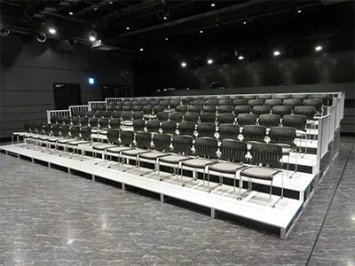 標準観覧席の2段5連セットであれば20名・3段5連セットであれば30名となっております。着席人数がお決まりの場合は設置サイズを基にご提案させて頂きますので弊社に一度ご相談頂ければと思います。06-6773-5306