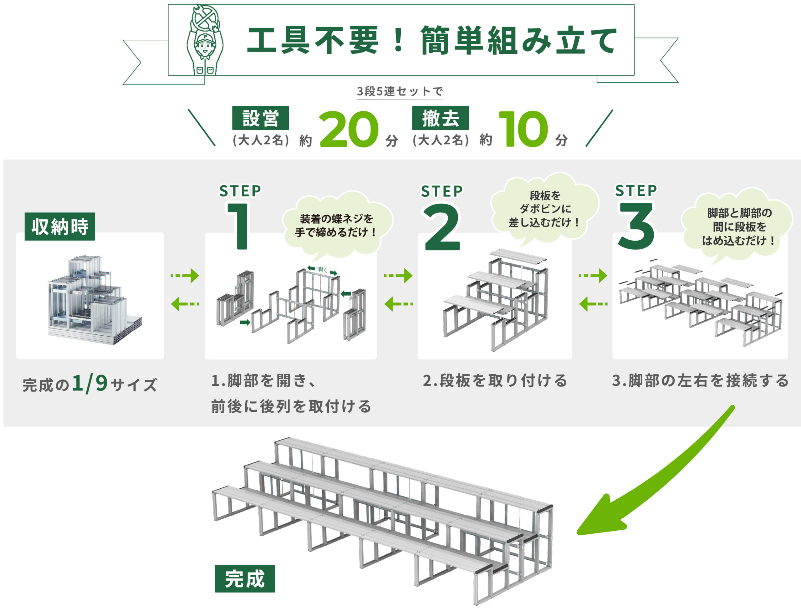 スポーツイベント開催時のグラウンドや体育館の1階部分など仮設で席数を増やしたい時に最適な観覧席です。初心者の方でも簡単に組み立てられ、撤収は設営時の半分の時間で済むなど時短に貢献します。