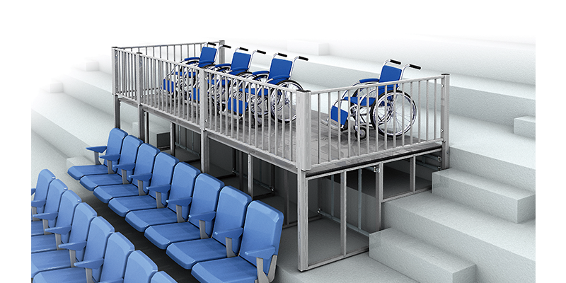 パックス工業の折りたたみ式アルミ製仮設ステージデッキ(車いす席対応)は、ダイバーシティに対応した多機能なステージです。スポーツ施設の観覧席と組み合わせて使用できるため、幅広い用途に対応可能です。このステージは、車いすの利用者も快適に過ごせる設計となっており、全ての人が参加できるイベントをサポートします。