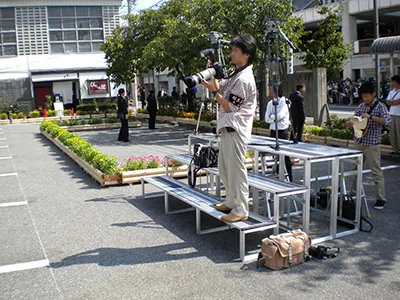 オプションでサイドステップがありこれを購入頂くことでひな段の両サイドから上り下りが可能です。