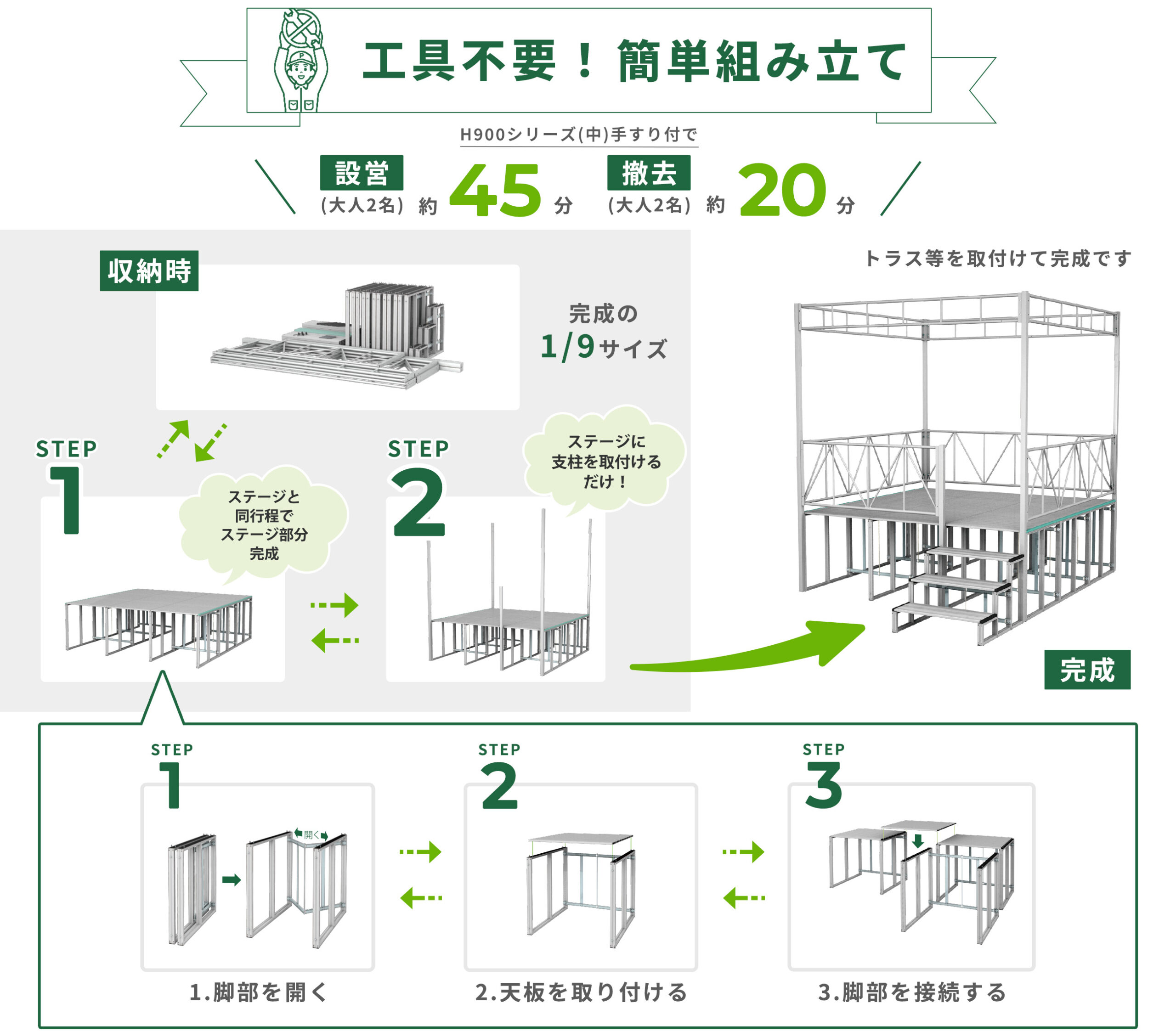 セット内容 | ・脚部:6台 ・天板:6枚 ・ジョイント天板:3枚 ・エンドキャップ:6本 ・ステップ1段型:1台 ・やぐら:1式 ・手すり:1式 |